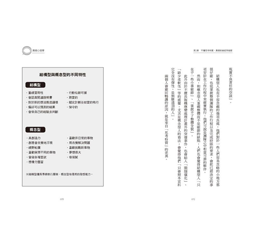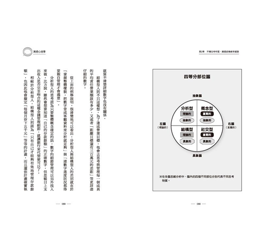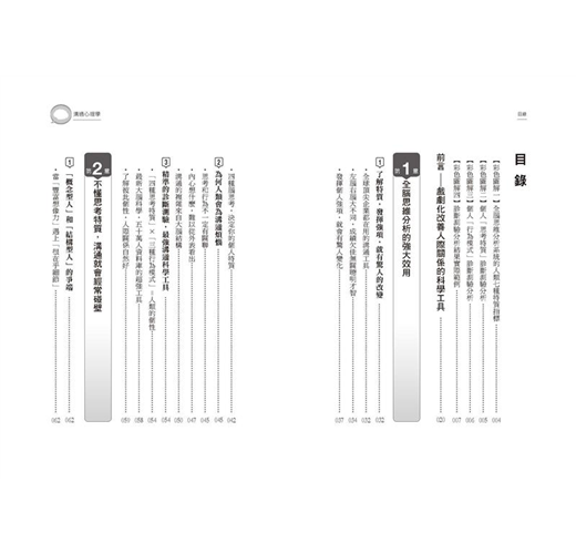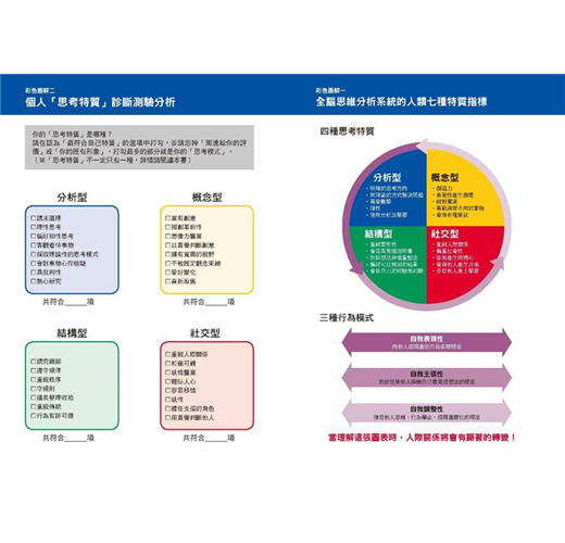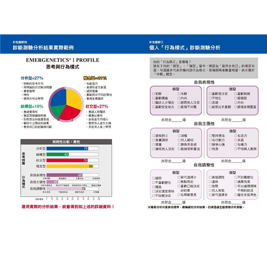 利用書中彩色圖解的測驗題目,只需要幾分鐘作答便能精準分析判讀受測者個性,是公司內部管理、員工潛能發掘、新人面試等等相當好用的工具。