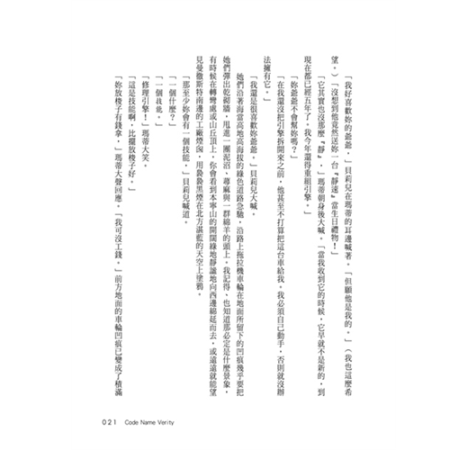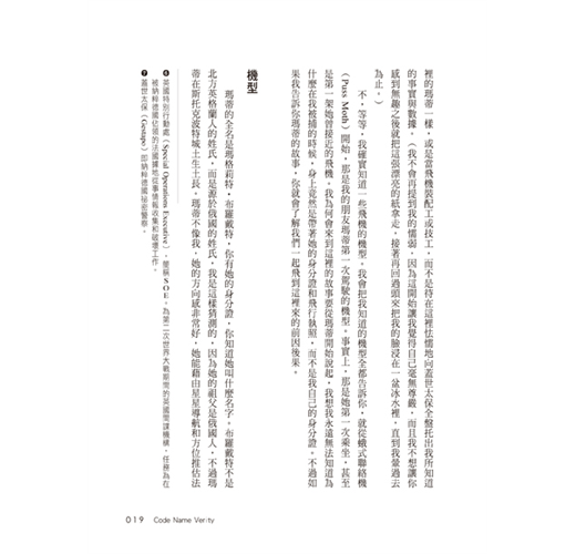 這部小說聲勢絕對水漲船高,部分原因毫無疑問來自於伊莉莎白.溫本身即身為女飛行員的寶貴經驗。但本書傑出之處不僅於此──溫暖奔放的角色性格、對史實考證的執著、設計巧妙的情節與戲劇性的懸疑、當然還有躍然紙上的生動敘述以及滿溢智慧之言辭。──《號角雜誌》,星號書評