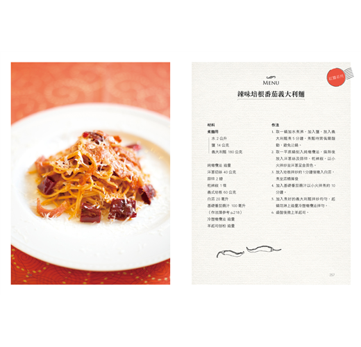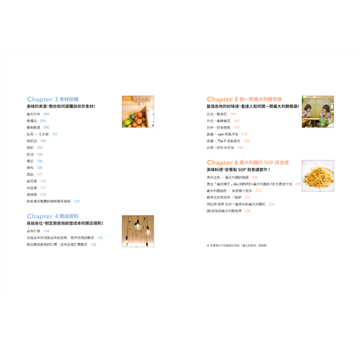對於這本書中除了介紹許多開餐廳該知道的行銷方式和專業知識以外,也收錄幾間很不錯的義大利麵餐廳,分享店主創業當時的心路歷程和想法,最後的篇章也提供了20 道基礎的義大利麵食譜,可讓有志於開餐廳的朋友們參考,一起為餐飲這塊領域注入新的創意與活力!我時常教育員工要保有創新精神,義大利麵是義大利人的傳統料理,最讓我感到敬佩的地方是義大利人對食材的選用,使用天然食材來調理出美味的料理,這是義大利堅守的料理法則,所以他們只採用當地盛產的新鮮食材,經由傳統的料理手法,創造出全世界大家耳熟能詳