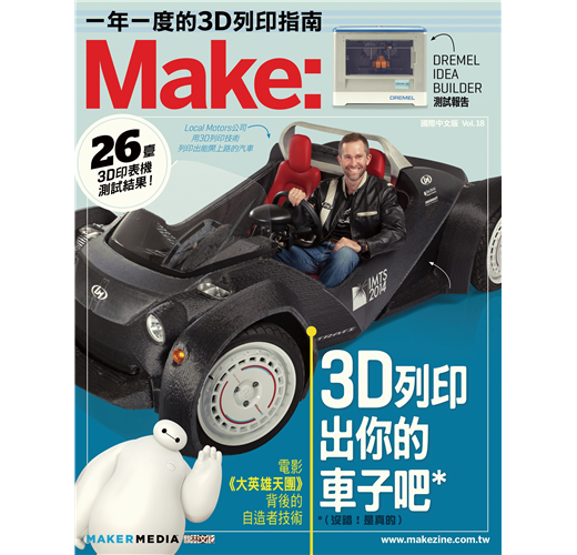 隨著3D列印技術以驚人的速度成長,《MAKE》雜誌為各位推出一年一度的3D印表機評測和審查單元,內容還包括列印軟體、列印作品、有趣的列印專題。