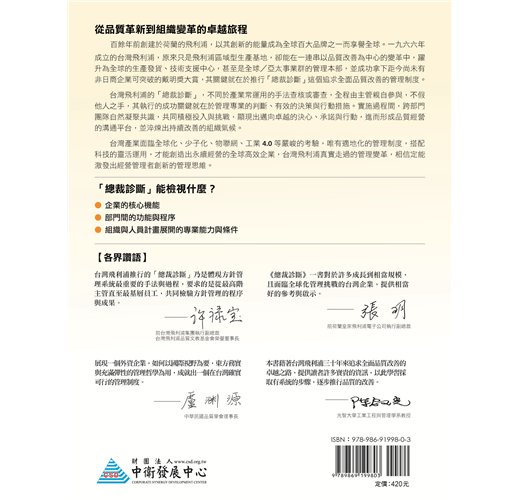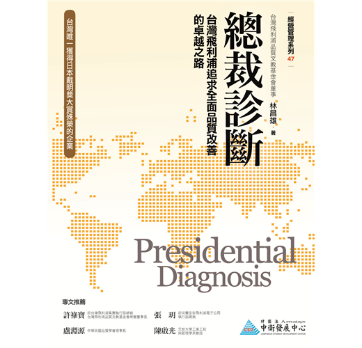 《總裁診斷》一書所闡述的理念、歷程及方法即是推行這一活動的現身說法。本書作者林昌雄先生先後在台灣飛利浦、飛利浦亞太電子組件事業部以及部門分割出去後的統寶、奇美電等集團出任要職,累積了數十年產業經驗。尤其是在任職飛利浦約30 年期間,親身參與推行「總裁診斷」的各種規劃與活動,從其中獲得許多寶貴的經驗與體悟。再加上林先生不時積極地吸收新知,可說是好學不倦之楷模,深信他所分享的珍貴經驗足以供追求組織卓越的領導者之切磋與借鏡。