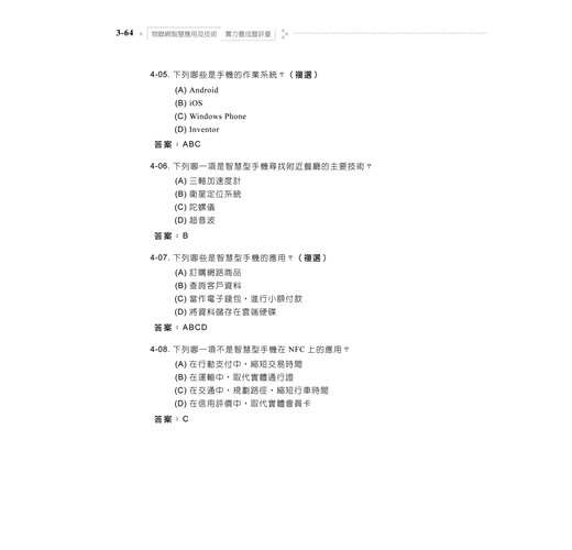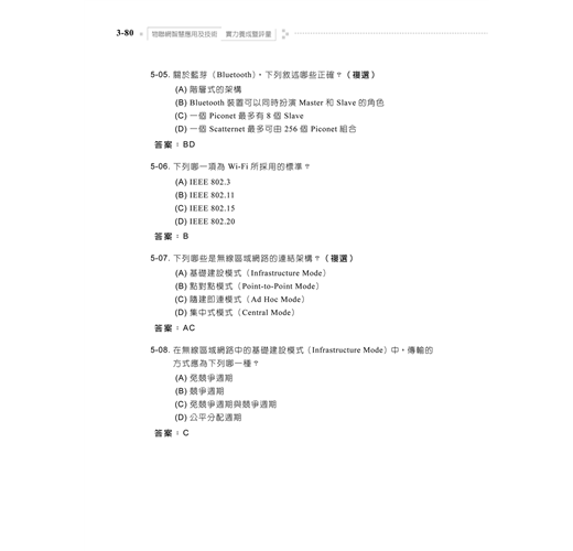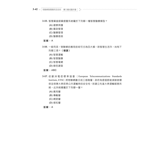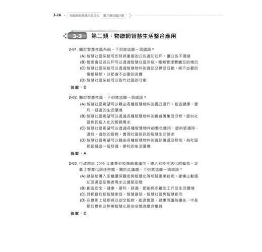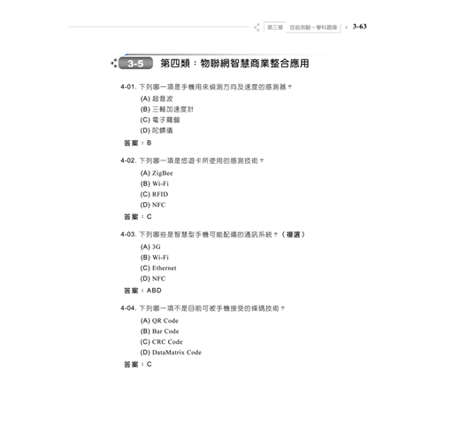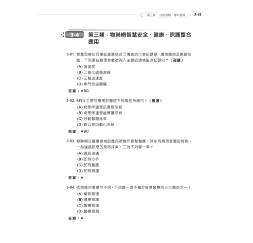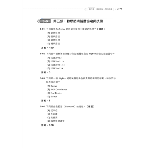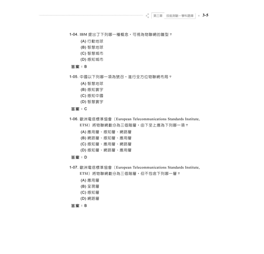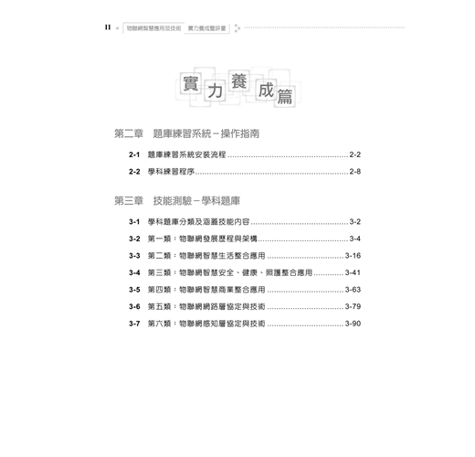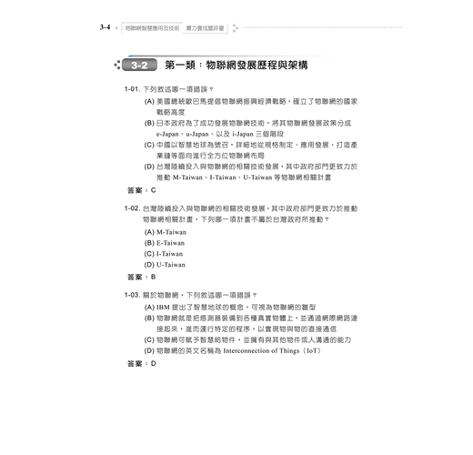2.囊括物聯網智慧應用及技術6類共350題學科題庫,包含「物聯網發展歷程與架構」、「物聯網智慧生活整合應用」、「物聯網智慧安全、健康、照護整合應用」、「物聯網智慧商業整合應用」、「物聯網網路層協定與技術」、「物聯網感知層協定與技術」等內容,為有意踏入物聯網相關領域的從業人員提供一份學習藍圖,期能引導學習者熟悉物聯網各階段的專業知識與應用場域。