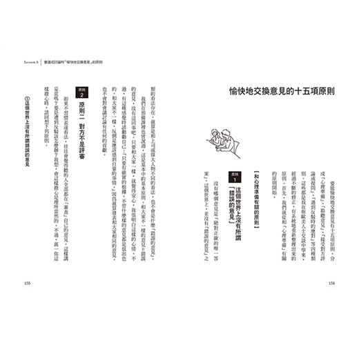 原則一 這個世界上沒有所謂「錯誤的意見」/原則二 對方不是評審/原則三 聽的人也要注視對方的雙眼/原則四 別人的話要從頭聽到尾/原則五 邊聽邊確認自己「是否可以理解」/原則六 「先暫且接受→轉到自己的主張」是鐵則/原則七 勇於承認別人的好意見/原則八 正面回答問題,不用問題來回答問題/原則九 反駁≠人格否定/原則十 把反駁視為對方的提問/原則十一 即使被踩到痛處,也要先接受再確認/原則十二 「我的看法不太一樣」是最佳臺詞/原則十三 即使遇到找碴或挑剔的言論,也不要跟著對方起舞/原則十四 不要不懂裝懂/原則十五 雞同鴨講時,找找看是否有「暗藏的前提」