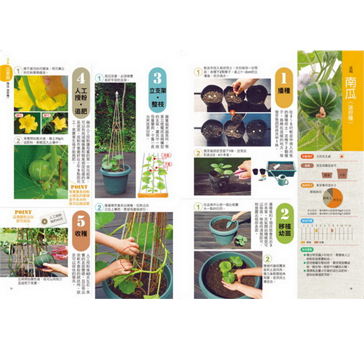 移植幼苗、摘花、追肥、人工授粉、收穫到隔年的育苗等過程,只要按照各步驟的照片與提示去做,就能種出看起來美觀、吃起來美味的蔬菜!