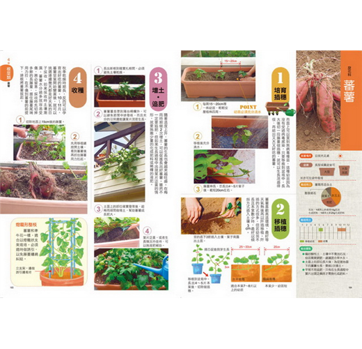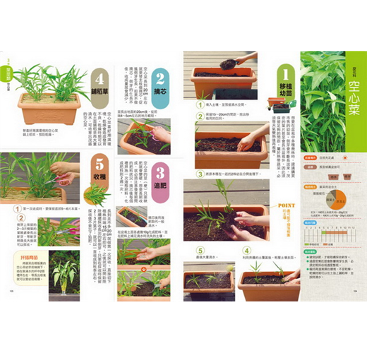 四季豆、甜玉米、苦瓜、花椰菜、空心菜、馬鈴薯、青蔥等,全書收錄82種各類型蔬菜與香草,不論是葉菜、根菜或是果菜類,想吃什麼就種什麼。