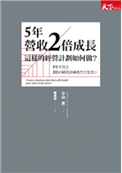 小山社長將其領導哲學、企業經營手法,以及如何一步一步實現5年營收2倍的作法,包括「事業計畫」、「經營計畫」、「利潤計畫」、「人才培育計畫」及「設備、資本計畫」等等,都有完整的闡述。由於自身有成功的經驗,說來信心十足,也有足夠的佐證與說服力,想要在事業經營領域更上層樓,或者正苦惱於組織呈現停滯狀況而亟思有所突破的企業主,本書絕對值得一讀!