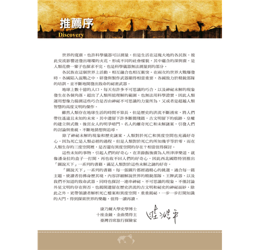 多年來秉持著探索人類未知世界的理念,歸納整理相關資料,蒐羅珍貴精美的圖片,向讀者介紹神祕未解的現象與歷史謎案,也期盼能滿足讀者的好奇心。