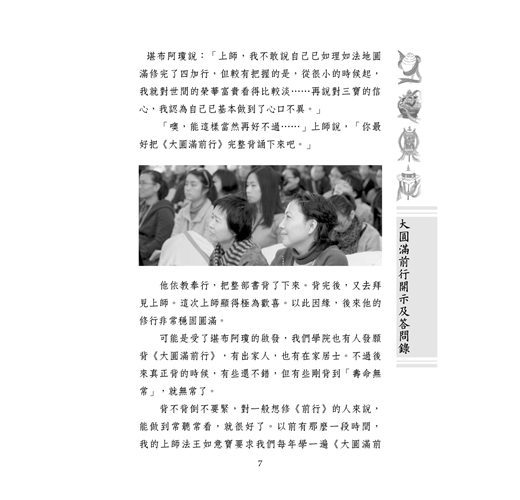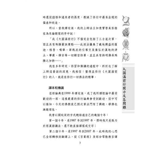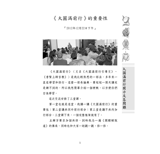 《大圓滿前行》有竅訣有次第,並以最簡潔的語言把你一生的修行都編寫好了,既完美又適合現代人,為什麼不學?2012 年12 月,堪布索達吉仁波切應邀前往中國文化書院,通過短短的三堂課,就一個修行人該如何依照次第修行,介紹了大圓滿前行的修法梗概及重點,同時也解答了在當前環境中,一般人怎樣才能將生活與修行結合等疑惑。講座及問答之餘,堪布也帶著學員進行了簡單禪修。