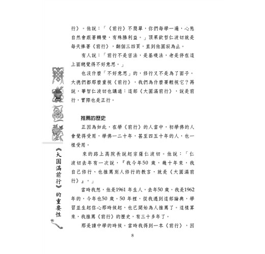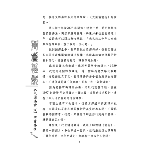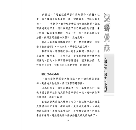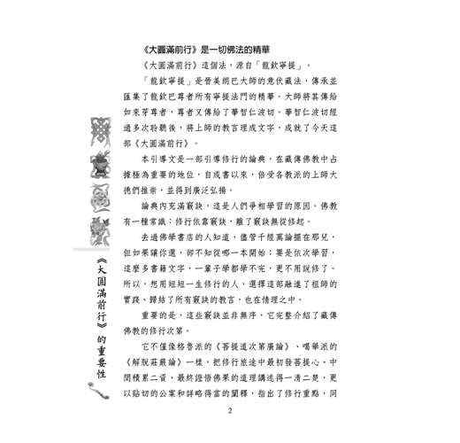 不論你是初學還是久修佛法,也不論你學的是漢傳、藏傳或其他教法,前行法都不可不修。因為前行是一切修行的基礎。懂得並修行《大圓滿前行》的人,就是在修行一切佛法的精華。