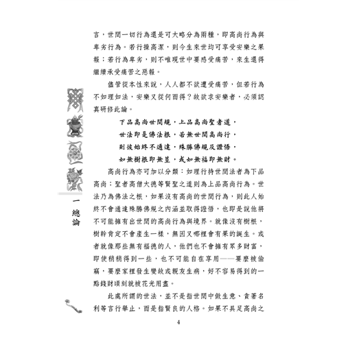 至於此論所宣講的主要內容,則可以論中的一首偈頌概括如下:「正士高尚行為者,樹根妙慧與穩重,樹莖有愧不放逸,樹枝正直誓堅定,樹葉知恩為利他,樹花信心發放施,樹果安樂及聲譽,此等缺一不可也。」此頌以大樹為喻,宣示了正士必須具備的十種人格基礎,以及由此而得到的兩種善果,全文也即圍繞著這些問題展開論述。它將做人所應注意的方方面面,以高度精確性的語言作了歸納宣說,若能將之融會於心,行者定不會違越佛規與世規。