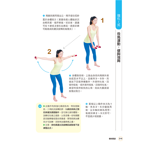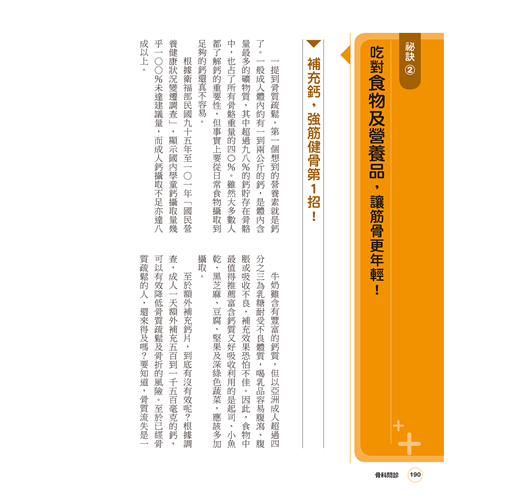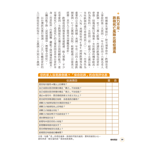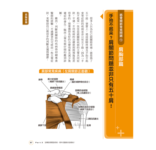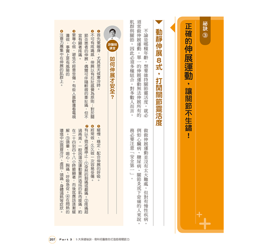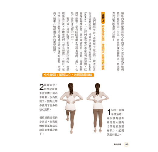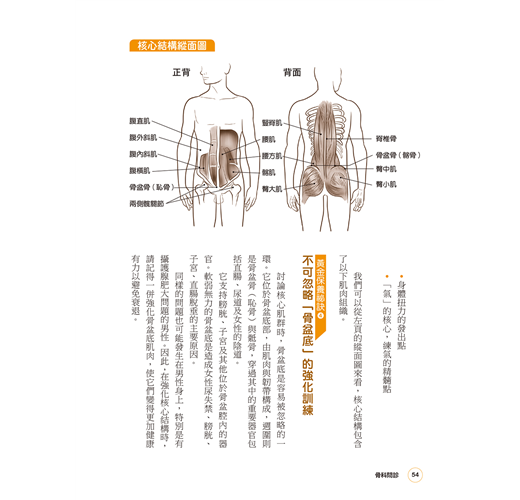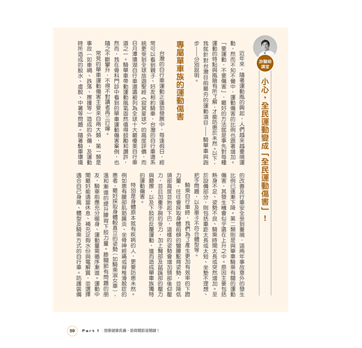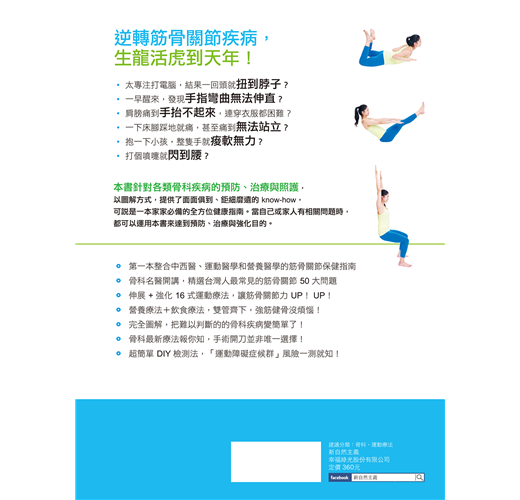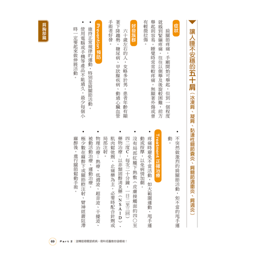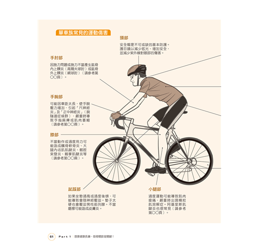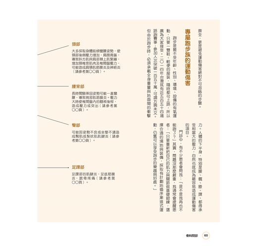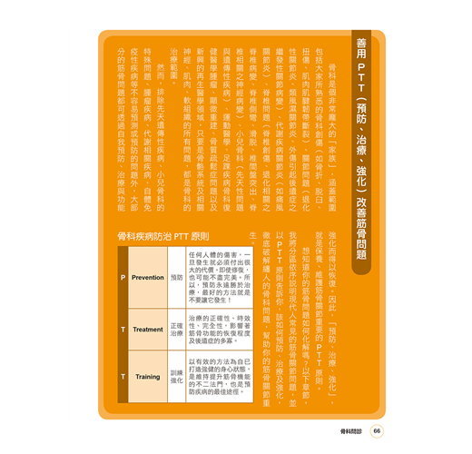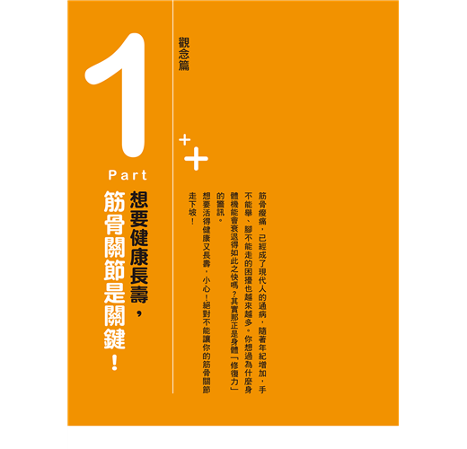 本書的編排非常清楚丶完整地呈現游醫師在筋骨關節方面的診療經驗和深入淺出的知識。讀者除了可以一囗氣讀完本書,完整地吸收骨科方面的知識外,還可以當做個人或家庭的保健工具書,實用性非常高;不論是自己或親友有哪方面的骨科問題,或者單純地想獲得單項保健知識,都可以在本書找到完整的答案,包含預防丶治療和平時的強化訓練。