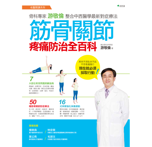 但怎樣的運動才適合自己?運動又如何開始?筋骨痠痛如何預防及治療?游敬倫醫師在這本書中,整合了中西醫、運動醫療和營養醫學,並精選國人最常見的筋骨五十大問題,同時,在書中的【保健篇】提供保健祕訣,並糾正一般錯誤觀念,像是依據範例執行運動,可強化肌力、遠離疾病,人人健康長壽,以及強化姿勢肌力、吃對食物營養品及正確伸展。因此,我樂於推薦這本書,希望你讀過之後,不要坐著等疾病衰老找上你,而是立即動起來讓老化追不上你。