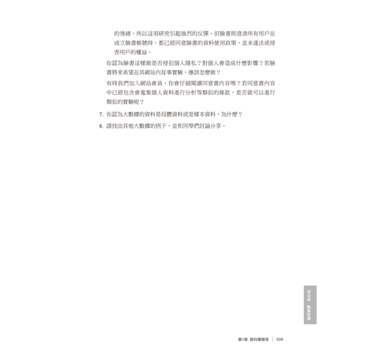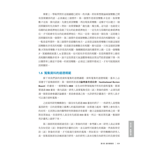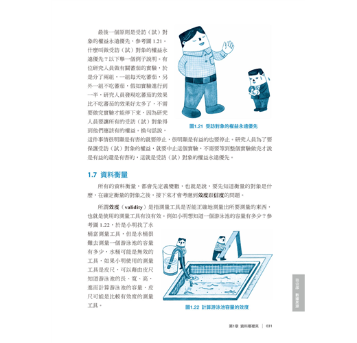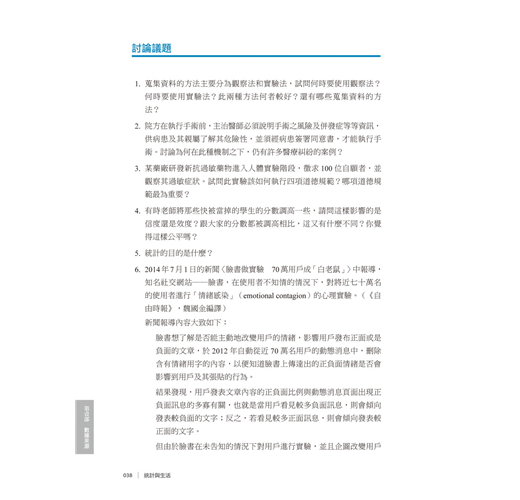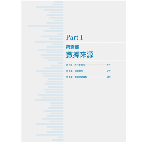 學習統計學的第一步,就是要認識「資料」(data),了解資料的基本型態及如何蒐集資料。而當我們在蒐集資料過程中,必須符合道德規範,以及使用正確地衡量工具,才能進行下一個步驟抽樣資料(第2 章)。本章節將介紹資料的不同型態、觀察性資料、實驗性資料、數據的展示、蒐集資料的道德規範及資料衡量工具的信度與效度。