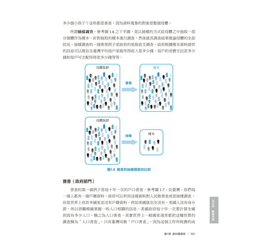 所謂普查,參考圖1.6之上半圖,是將整個母體納入觀察,以全部母體作為調查對象,換句話說,就是百分之百的抽樣。利用普查所得到的資料則是母體資料,例如臺灣有多少人?去年有多少人參加大學指考?去年有多少人結婚,多少人離婚,生下多少個小孩子?這些都是普查,因為資料蒐集的對象是整個母體。