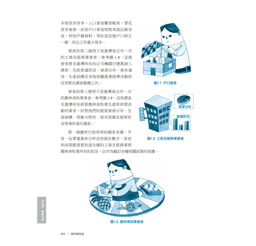 普查的第三個例子是臺灣每五年一次的農林漁牧業普查,參考圖1.9。這是調查全臺灣所有經營農林漁牧業生產和休閒活動的業者,針對他們的經營資源分布、生產結構、勞動力特性、資本設備及經營狀況等情形進行調查。