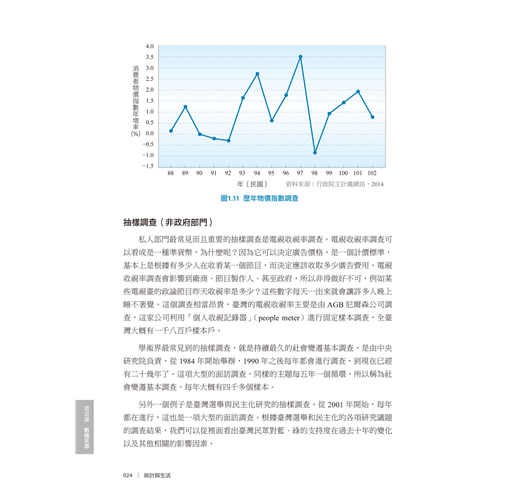 第二個調查是物價調查,參考圖1.11。政府每十天調查一次全臺灣的物價, 調查單位會先定義很多標準,譬如設定424種商品,每旬調查,同一個物品在臺北、臺中、新竹及高雄,各賣多少錢,分別記錄下來,每個月再根據這些物價資訊編製成物價指數(請參考第7章),而這個物價指數是可以拿來做很多其他延伸的用途,例如許多人能藉以知道現在的薪水比起物價來講是相對上升還是下降。