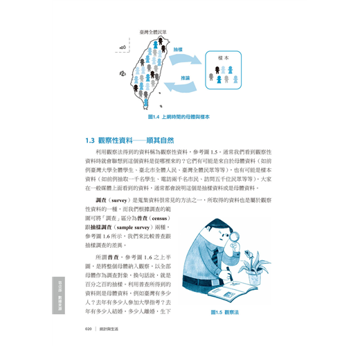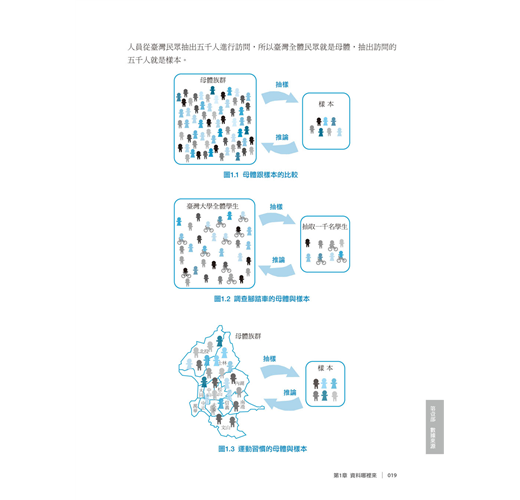 利用觀察法得到的資料是很常見的,而觀察性資料通常會有母體資料和樣本資料的區分。參考圖1.1,讓我們先大致了解一下母體(population)和樣本(sample)的差別。