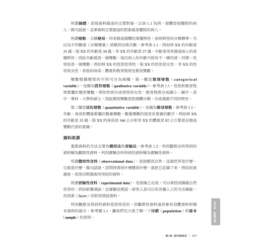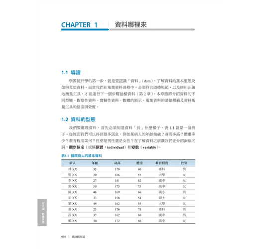 我們要處理資料,首先必須知道資料「長」什麼樣子,表1.1就是一個例子。從裡面我們可以得到很多訊息,例如某病人的年齡幾歲?身高多高?體重多少?教育程度如何?性別是男性還是女性?在了解資料之前讓我們先介紹兩個名詞:觀察個案(或稱個體,individual)和變數(variable)。