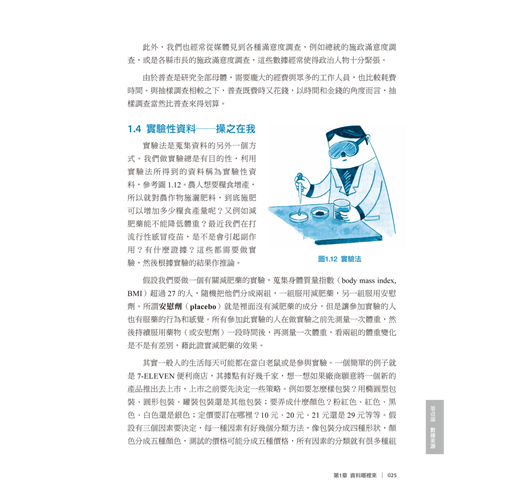 實驗法是蒐集資料的另外一個方式。我們做實驗總是有目的性,利用實驗法所得到的資料稱為實驗性資料,參考圖1.12。農人想要糧食增產, 所以就對農作物施灑肥料,到底施肥可以增加多少糧食產量呢?又例如減肥藥能不能降低體重?最近我們在打流行性感冒疫苗,是不是會引起副作用?有什麼證據?這些都需要做實驗,然後根據實驗的結果作推論。