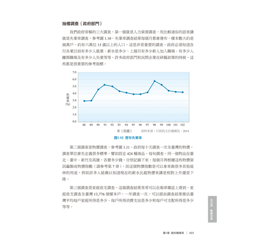 我們政府常稱的三大調查,第一個就是人力資源調查,用比較通俗的話來講就是失業率調查,參考圖1.10。失業率調查結果每個月都會發布,樣本數大約是兩萬戶,約有六萬位15歲以上的人口,這是非常重要的調查。政府必須知道各行各業目前有多少人就業、薪水是多少、上個月有多少新人加入職場、有多少人離開職場及有多少人失業等等。許多政府部門和民間企業在研擬政策的時候,這些都是很重要的參考指標。