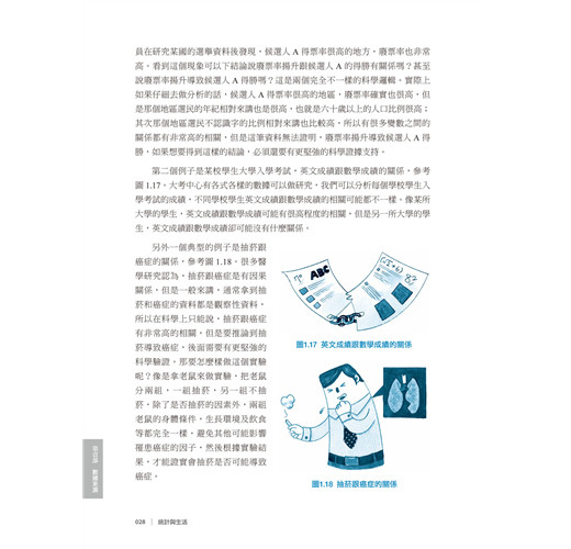 讓我們看看以下的幾個例子,第一個例子是某國總統候選人A獲勝和各地區廢票率的關係,參考圖1.16。一位研究員在研究某國的選舉資料後發現,候選人A得票率很高的地方,廢票率也非常高。看到這個現象可以下結論說廢票率揚升跟候選人A的得勝有關係嗎?甚至說廢票率揚升導致候選人A得勝嗎?這是兩個完全不一樣的科學邏輯。實際上如果仔細去做分析的話,候選人A得票率很高的地區,廢票率確實也很高,但是那個地區選民的年紀相對來講也是很高,也就是六十歲以上的人口比例很高; 其次那個地區選民不認識字的比例相對來講也比較高,所以有很多變數之間的關係都有非常高的相關,但是這筆資料無法證明,廢票率揚升導致候選人A得勝,如果想要得到這樣的結論,必須還要有更堅強的科學證據支持。