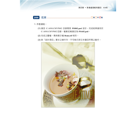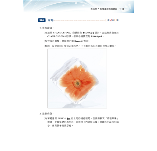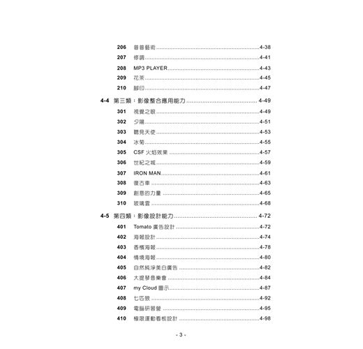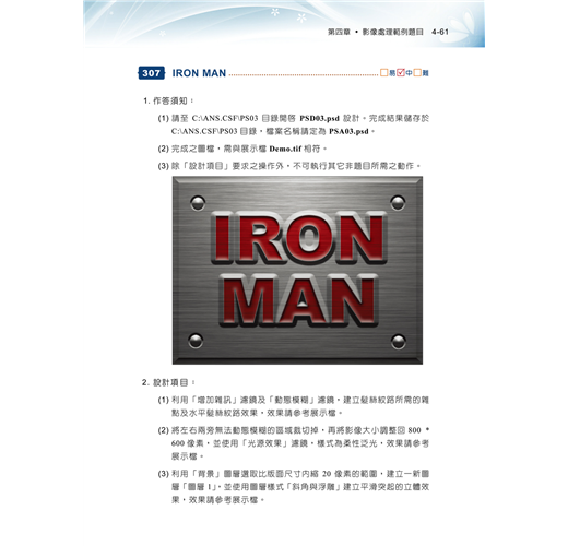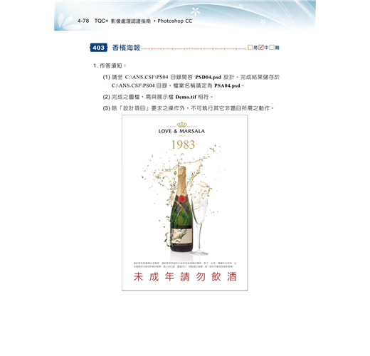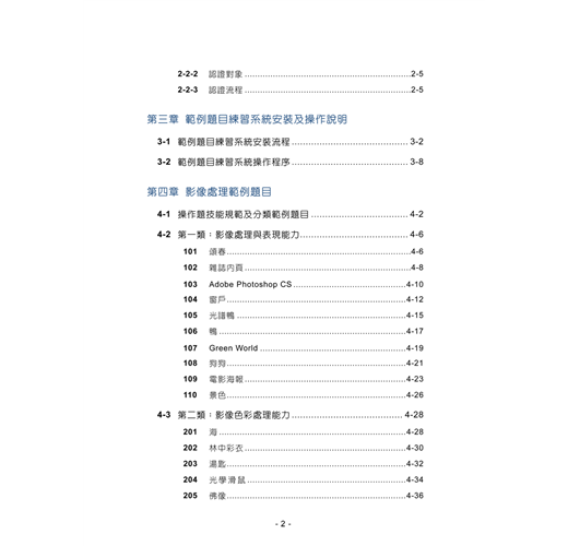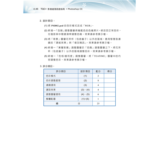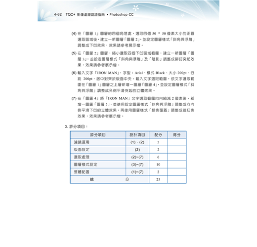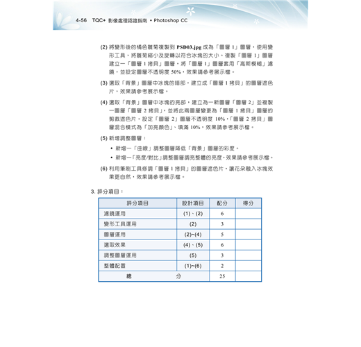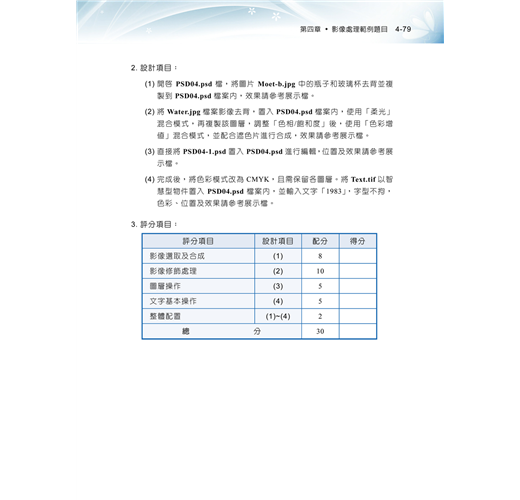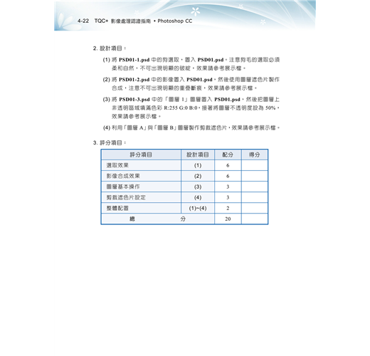 操作題型提供各種範例共計4大類40題,包含「影像處理與表現能力」、「影像色彩處理能力」、「影像整合應用能力」及「影像設計能力」等類別,以實際範例透過設計功能剖析,提供讀者最實用的技巧,為Photoshop CC的人才評鑑建立了公正客觀的參考標準。