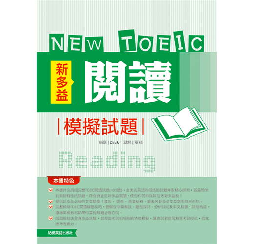 ■本書共含四組完整TOEIC閱讀試題(400題),由美式英語為母語的試題專家精心撰寫,涵蓋簡單到具挑戰性的試題,符合真正的新多益閱讀,使你作答時就如在考新多益般!