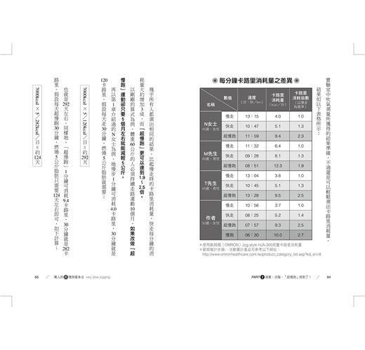 大多數民眾如果超慢跑,1公里也只需5~6分鐘而已,我的速度雖然比他們更慢,但當初練習時1公里大概也只需要7分鐘就能跑完。既然淺井小姐1公里能跑7~8分鐘,也就代表我可以再慢一點,於是我決定嘗試1公里跑8~9分鐘,沒想到跑起來真的相當輕鬆愉快。其實,我如果走快一點,1公里大概不到9分鐘也能走完,也就是說,1公里8~9分鐘的慢跑速度就跟走路差不多,但跑步比走路更輕鬆也更暢快。