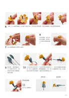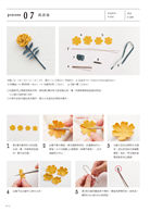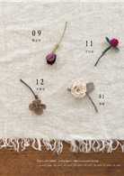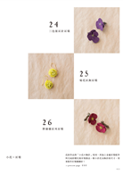華麗嬌豔的薔薇、大瓣典雅的山茶花、小巧可愛的球菊、氣質大方的銀蓮花……共29款以布料作成的花朵配飾,皆無需專業的製花工具,只要挑選自己喜歡布料、依照紙型裁剪,再經由簡單的上漿、捲揉或刻劃壓紋(製造自然的花瓣質感),最後以手縫或黏貼組合,就能簡單完成令人眼睛為之一亮的飾品。