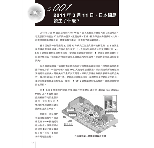隨著日本福島核事故的不斷演變,民眾的恐慌也在不斷地演變,在美國出現過少量搶購碘片現象,在我國部分地區,曾出現過短暫的搶購碘鹽現象。隨著各國政府的及時引導,民眾的反應逐步趨於平靜。然而,在短時間內完全清除核事故所帶來的影響是不切實際的,我們應該清楚地認識到福島核事故的處理時間需要用「年」來計算。為此,作為一位核技術工作人員,我利用所瞭解的核與輻射知識,用通俗的語言,結合科普知識插圖,通過120個問答的表現形式,力求系統、科學地剖析日本福島核事故,分析核與輻射的表現特徵、可能對人和自然造成的危害,介紹輻射對人體健康的影響,以及民眾嚴防輻射需要掌握的防護、自救措施。