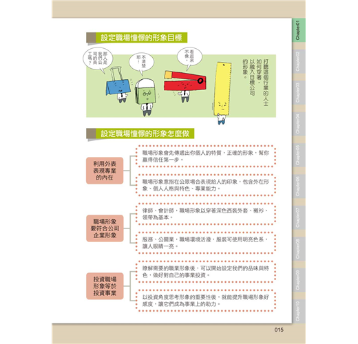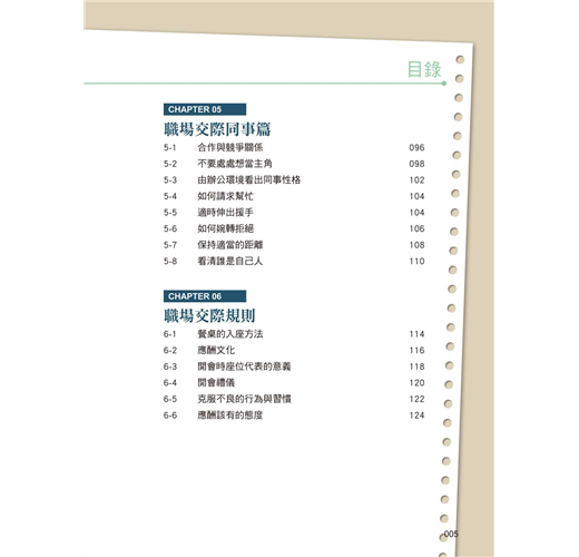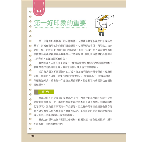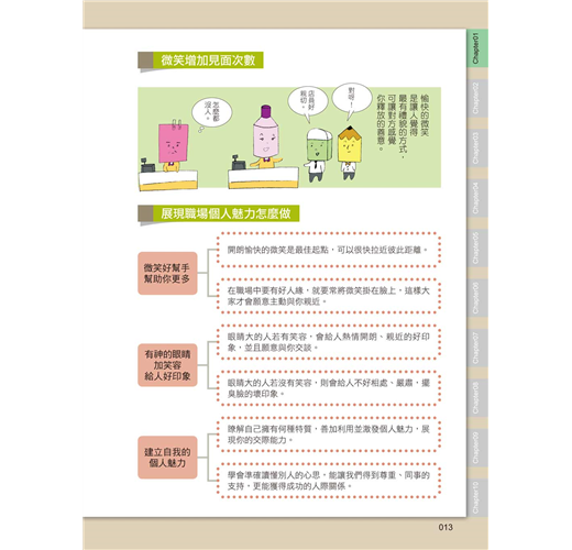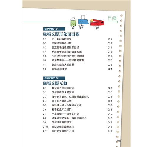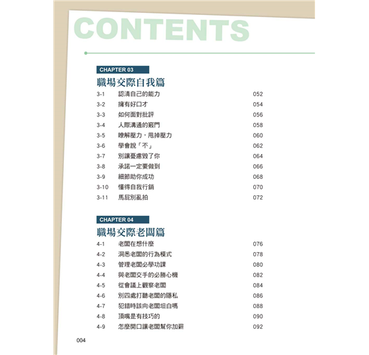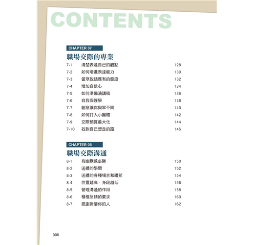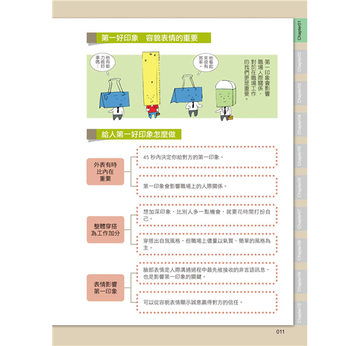 1.全書分為十個篇章,內文說明詳盡,先從自身培養和形象改造做起,再分門別類,說明針對不同對象的應對進退之道。