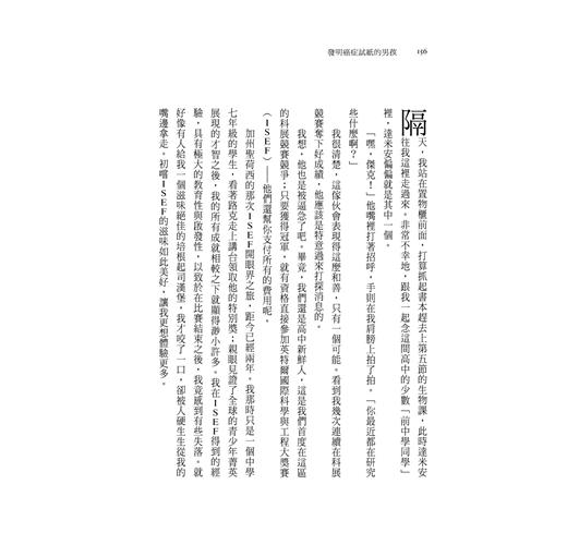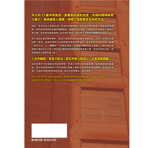 這本自傳不只是個風光的成功經驗,更是一則青少年克服憂鬱、自我懷疑與校園霸凌,並在科學領域闖出一片天的動人故事。面對生命中的苦澀與艱難,他是如何處理?又是如何堅持對科學的熱情,終於在世界舞台上發光發熱?