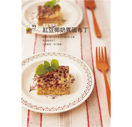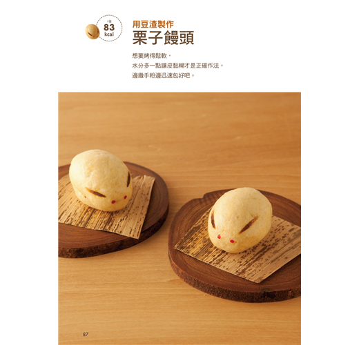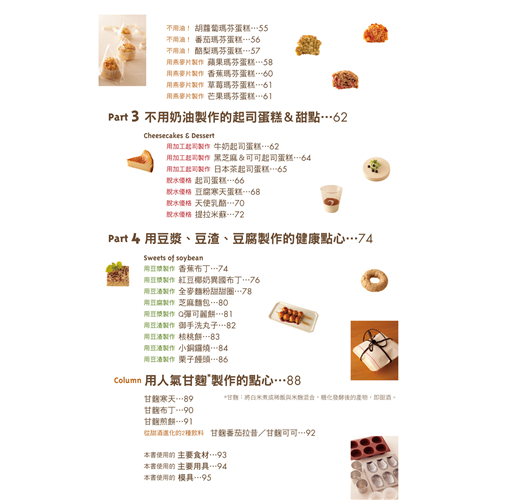 巧妙使用豆渣、黃豆粉及全麥麵粉等等,製作老少咸宜的健康餅乾;不用蛋也可以享受美味價值超高的奶油蛋糕;可可及豆漿一同完成小孩子熱愛的巧克力蛋糕系列;全麥麵粉及優格締造出零負擔無罪惡的烘焙蛋糕。