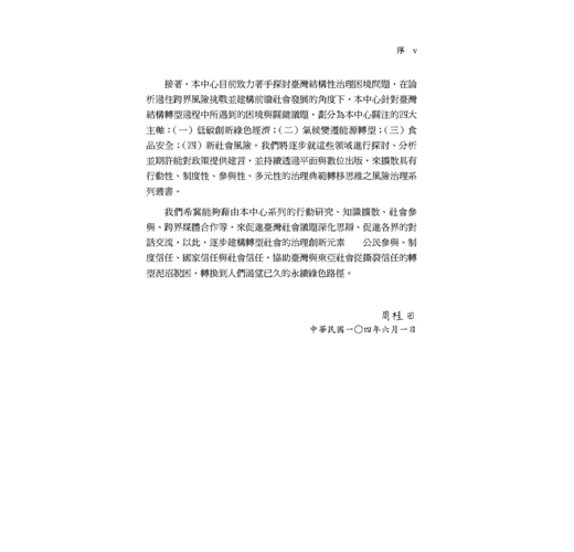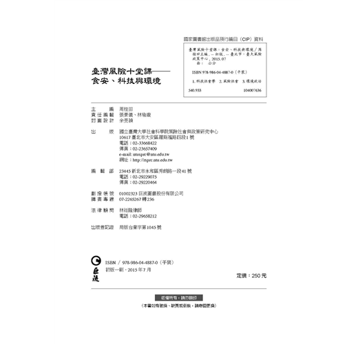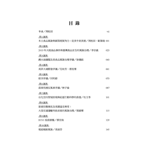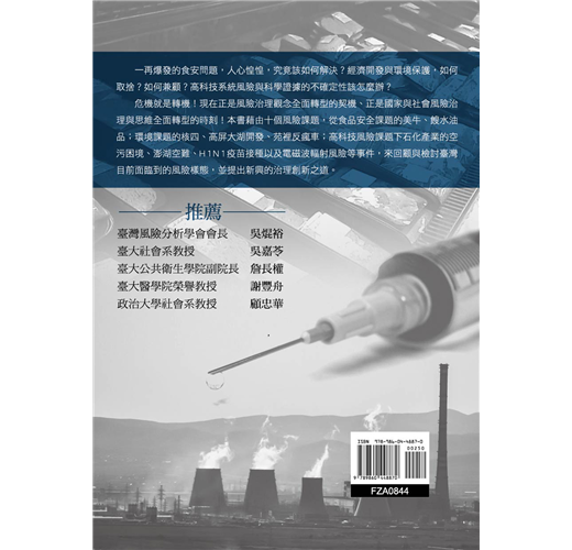 危機就是轉機!現在正是風險治理觀念全面轉型的契機、正是國家與社會風險治理與思維全面轉型的時刻!本書藉由十個風險課題,從食品安全課題的美牛、餿水油品;環境課題的核四、高屏大湖開發、苑裡反瘋車;高科技風險課題下石化產業的空污困境、澎湖空難、H1N1疫苗接種以及電磁波輻射風險等事件,來回顧與檢討臺灣目前面臨到的風險樣態,並提出新興的治理創新之道。