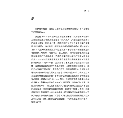 「從核災到地溝油,從石化氣爆到粉塵閃燃,風險社會推陳出新、不斷變體。面對這些苦難與恐懼,我們必須認真複習臺灣風險的十堂課,嚴肅思考制度面的改革。」