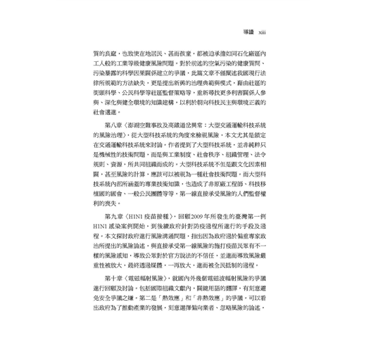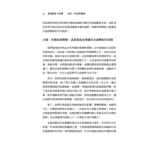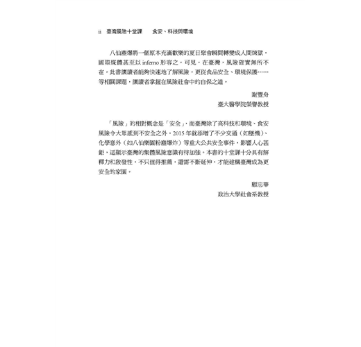 「『風險』的相對概念是『安全』,而臺灣除了高科技和環境、食安風險令大眾感到不安全之外,2015 年就添增了不少交通(如墜機)、化學意外(如八仙樂園粉塵爆炸)等重大公共安全事件,影響人心甚鉅,這顯示臺灣的集體風險意識有待加強。本書的十堂課十分具有解釋力和啟發性,不只值得推薦,還需不斷延伸,才能建構臺灣成為更安全的家園。」
