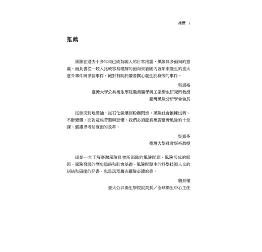 「風險在過去十多年來已成為國人的日常用語,風險具多面向的意義。而此書從一般人比較容易理解的面向來看國內近年來發生的重大意外事件與爭論事件,絕對有助於讀者關心發生於身旁的事件。」