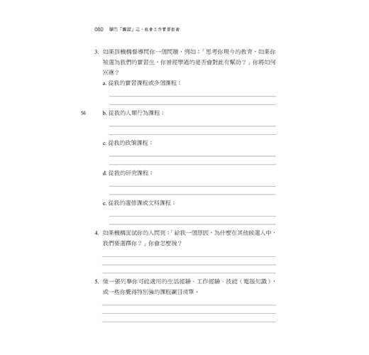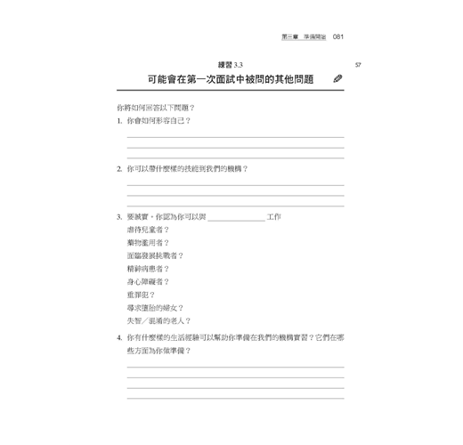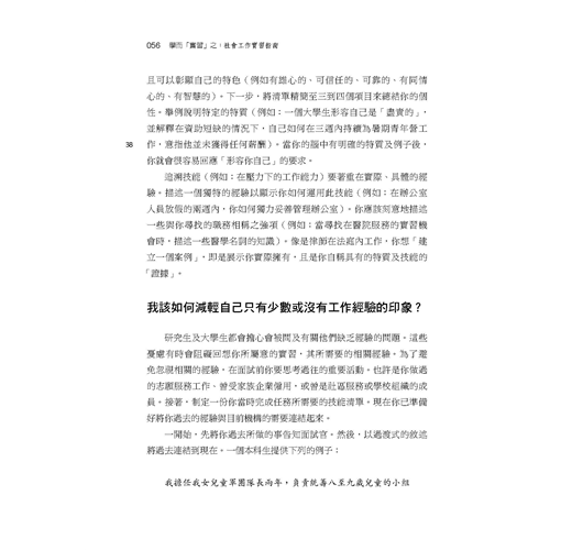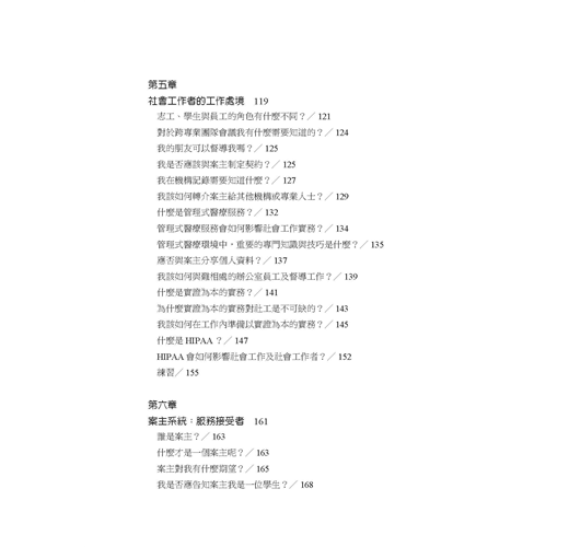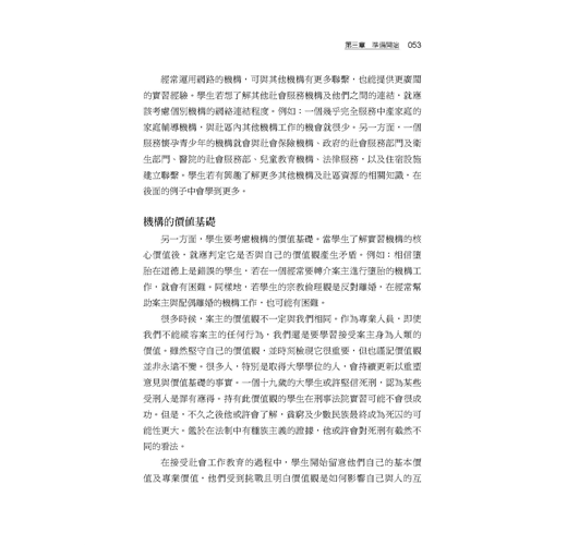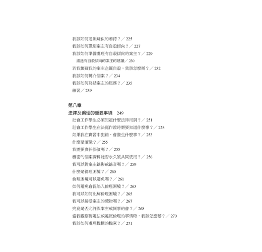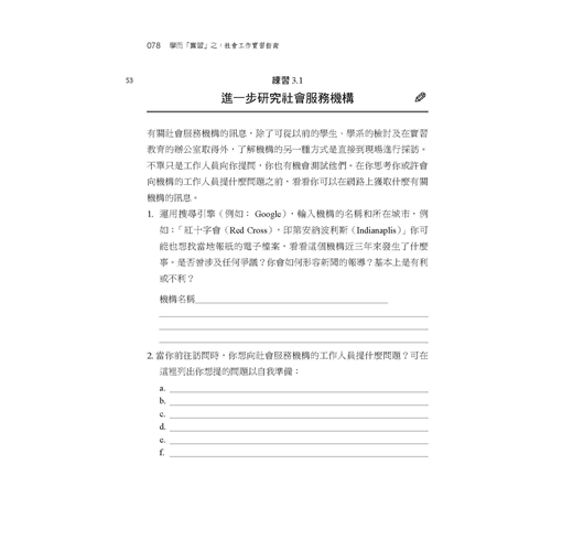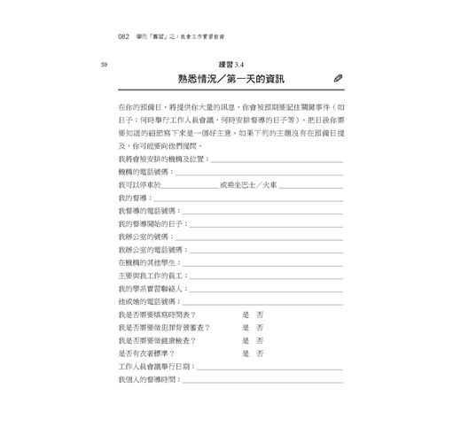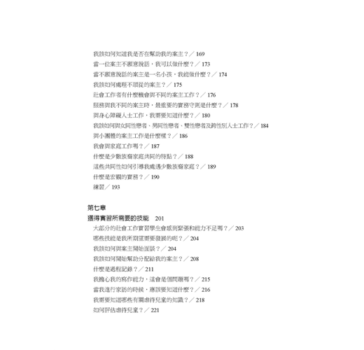 本章的實習建議包括了書中其他地方沒有涵蓋的情況和主題。為社會工作實習中可能產生的各式各樣問題提供答案。