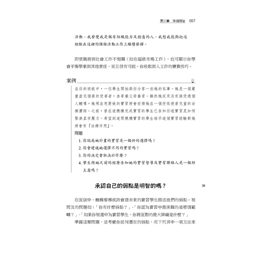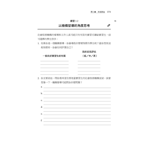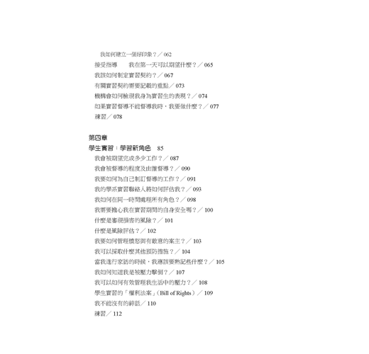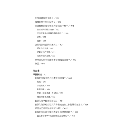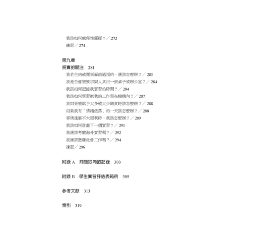 實習有別於課堂學習,往往令學生感到徬徨;但只要隨著本書的脈絡,理解書中生活化的案例,善用各章的練習,就能一步步解開對實習的疑惑。只要你準備充足,實習時遇上困難就能充滿自信、迎刃而解,達到學而「實習」之的最佳效果。
