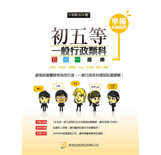 ◎收錄初五等考試一般行政類科—國文、公民、英文、法學大意、行政學大意,近五年試題及詳解!