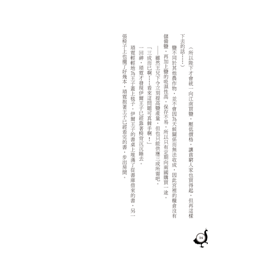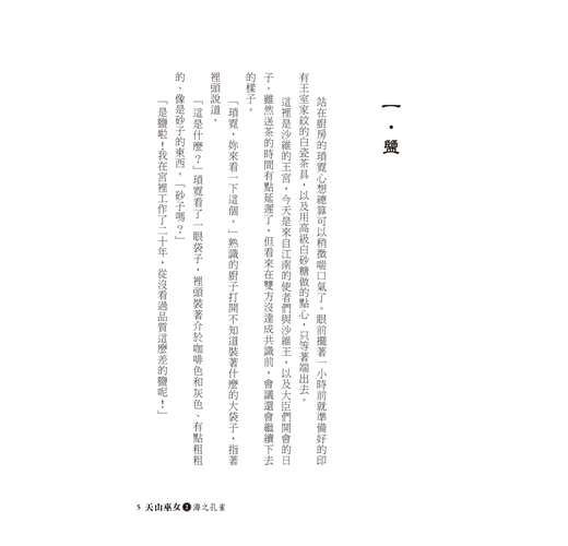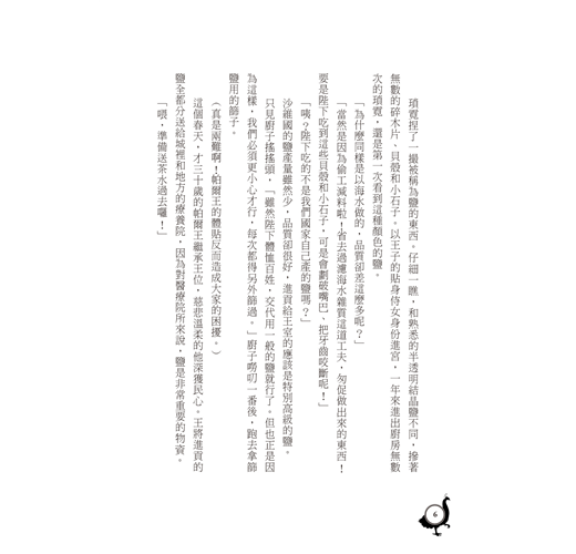 瑣霓捏了一撮被稱為鹽的東西。仔細一瞧,和熟悉的半透明結晶鹽不同,摻著無數的碎木片、貝殼和小石子。以王子的貼身侍女身份進宮,一年來進出廚房無數次的瑣霓,還是第一次看到這種顏色的鹽。