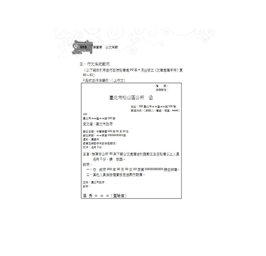 .必考重點,嚴選範例:根據公文寫作重點,精選典型範例詳盡解說,達到加深閱讀印象、從做中學的效果。