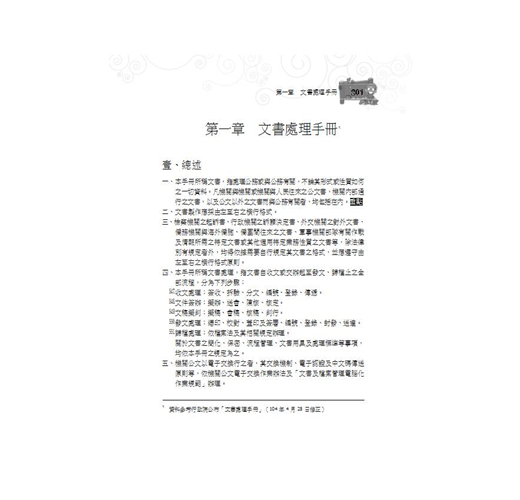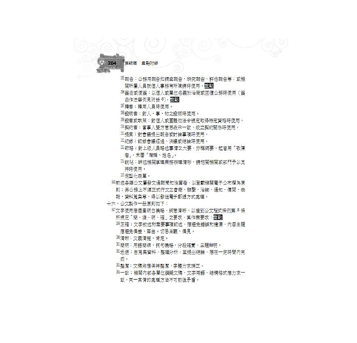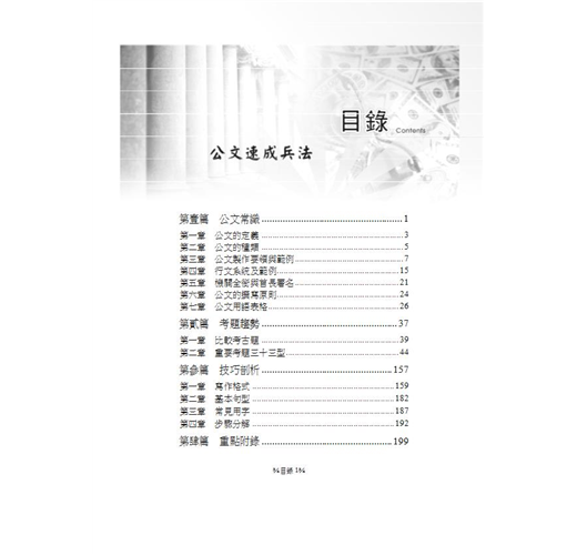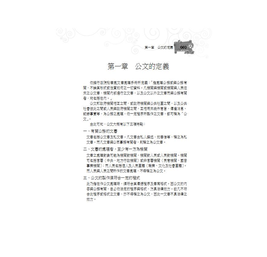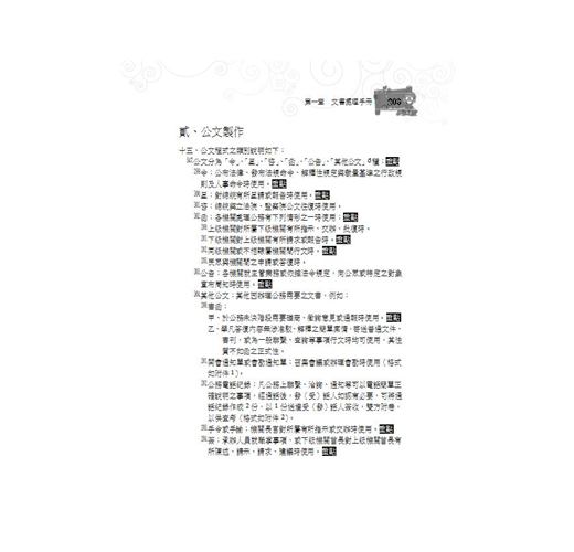 .要點簡明,扼要精確:結合作者多年教學經驗,層序漸進安排章節,將公文各大要項進行拆解分析,使讀者能快速掌握公文寫作要項。