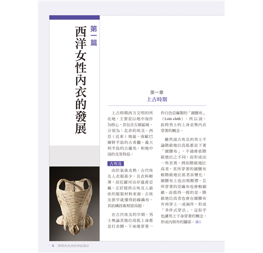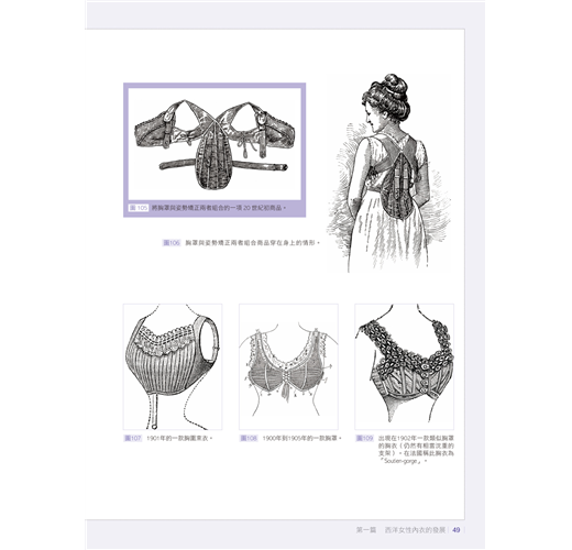 其中在西方內衣部分,雖然西方在內衣的議題上已有不少的專論,不過本書除了重組這些資料之外,也論說服飾輪廓與內在服裝的關係,以及著力於內衣專利引述的切入等等,其目的都是希望讓內衣與歷史時代之間的關連性,有更契合的鋪陳。