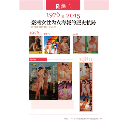 「專有名詞」對一項專業領域的建立是很重要的。為此,本書特別規劃中英文照對,並繪製出圖像來加以對應。當然,「從1976年至2015年臺灣女性內衣海報的歷史軌跡」(以台灣華歌爾公司為例),這些畫面完整的展現,絕對有助於掌握到臺灣內衣發展的脈絡。
