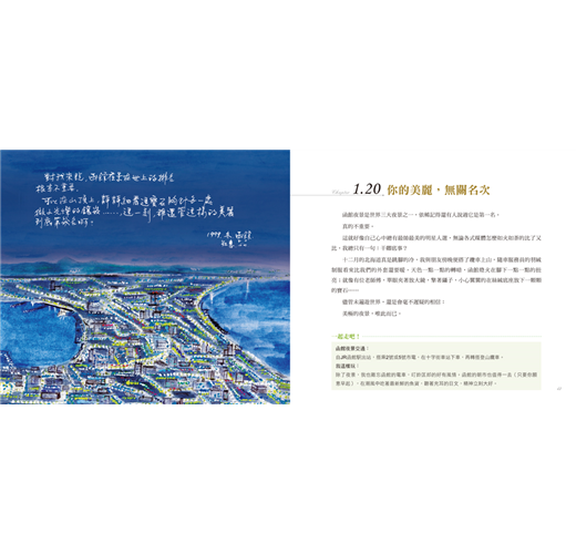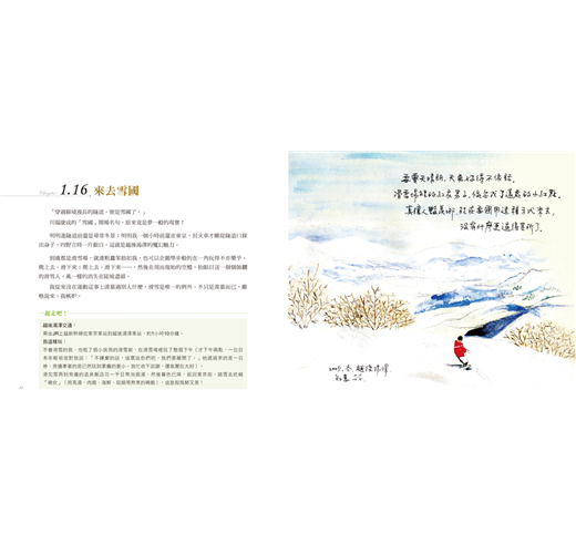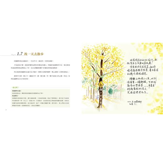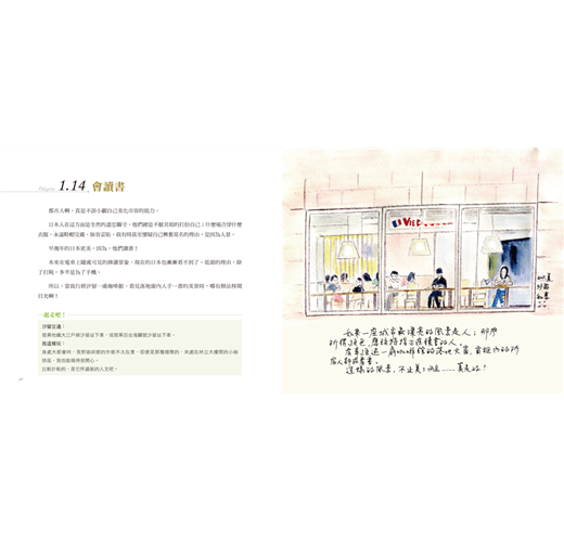 於是,在這本旅誌中,作者除了以一貫細膩的水彩與溫潤的文字,讓台場的旅人早餐、輕井澤的完美夏日、函館的璀璨夜景……在書頁中翩然登場;也紀錄了表參道旁與咖啡車老闆偶遇時,懾服於其不卑不亢的工作態度;在大雪紛飛的小樽,看身邊乘坐人力車旅客的優雅、從容、不跌跤,心中偷偷泛起的微酸滋味……不盡然是粉紅泡泡的旅程,更像是人生,卻也豐富了人生。