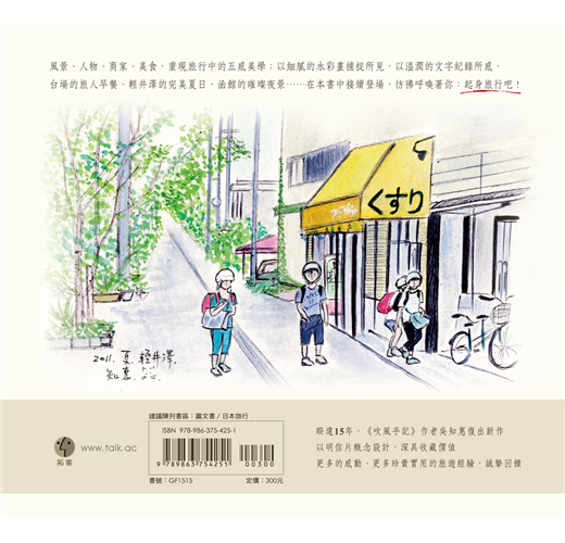 本書特色:※風景、人物、商家、美食四大主題,超過70幅精美水彩作品重現旅行中的五感美學。