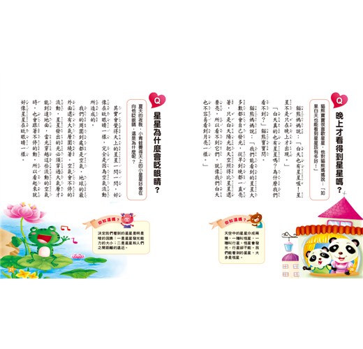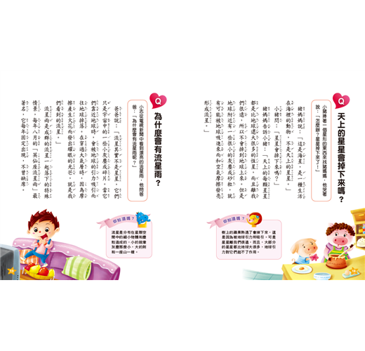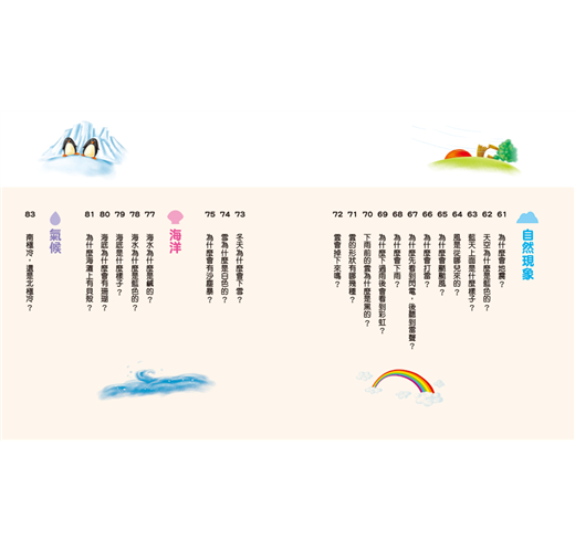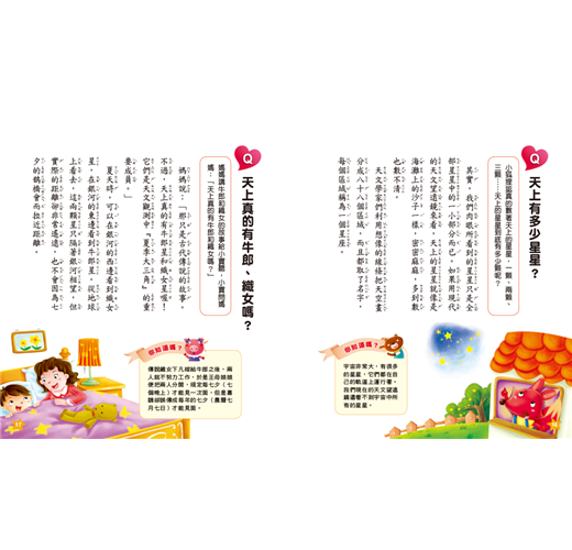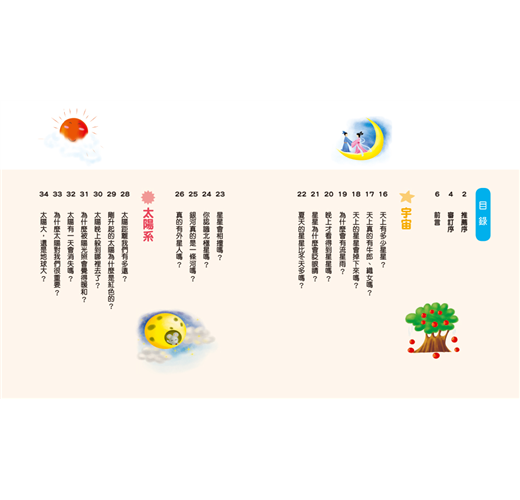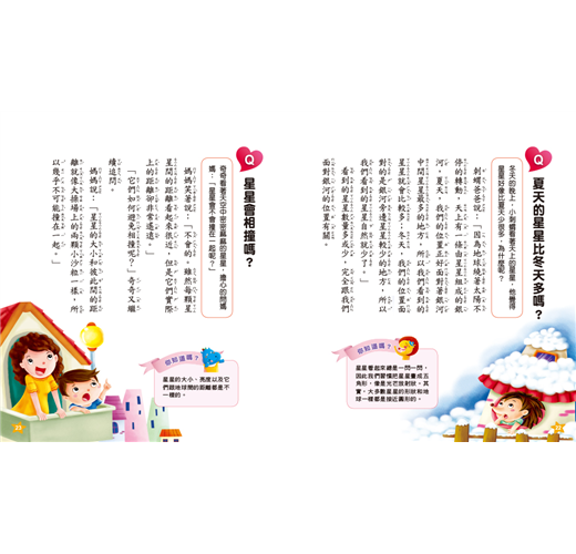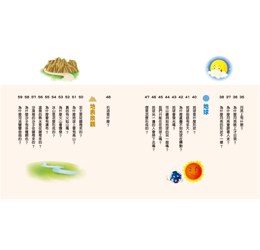 1.精選孩子最好奇的各種天文、地理、自然相關問題,藉由情境故事對話、擬人等方式,運用淺顯易懂的文字,讓孩子可以輕鬆閱讀,也容易理解,以達到解答孩子每個疑問的目的。2.配合生動活潑的插畫,將題目圖像化,提高孩子的閱讀興趣。3.每個問題中皆安排了「你知道嗎?」的延伸補充,一方面讓孩子的知識更完整,另一方面也可以幫助孩子理解問題,並擴展相關的常識。