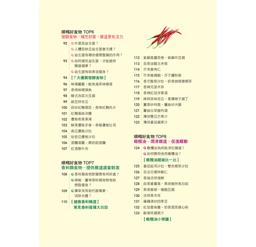 膳食纖維、寡醣、維生素C、鹼性食物、黏滑性食物、益菌、辛香料、橄欖油,幫助腸道代謝毒素,健康無毒一身輕!