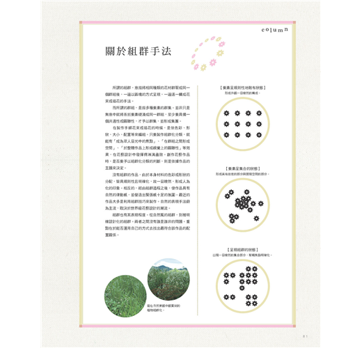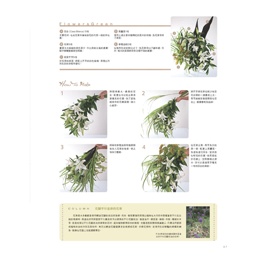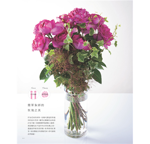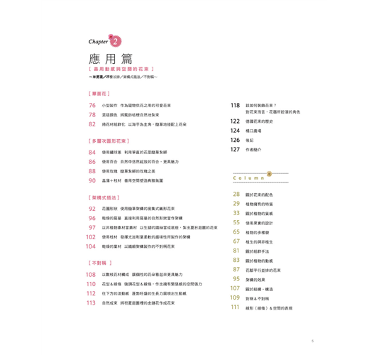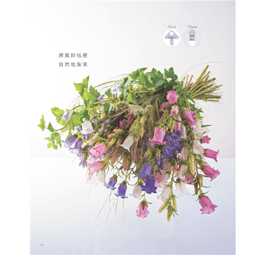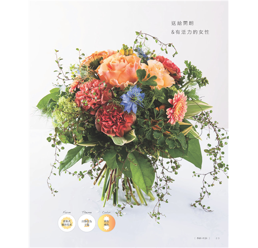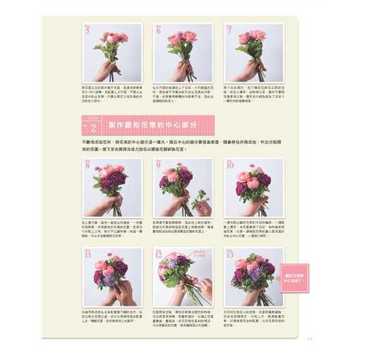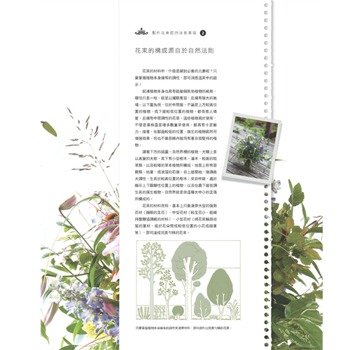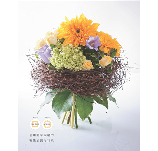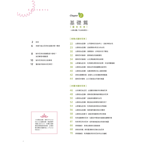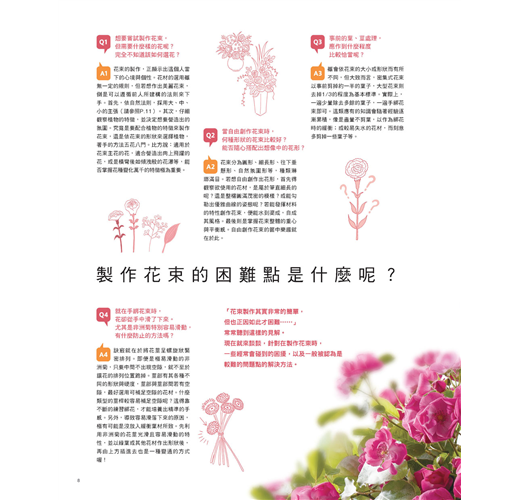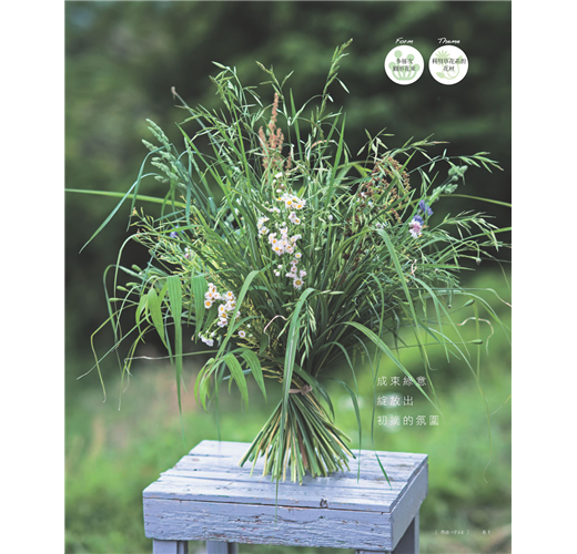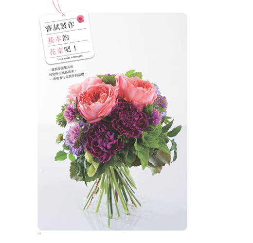 書中從基礎的花材處理開始講解,基本的紮花束技巧也有清楚的圖片步驟說明,配合不同顏色主題、不一樣的主花材、變化的花束形狀,構成多采多姿的花束作品。有時也可以藉著觀賞大自然中植物的生長型態或顏色搭配,在自己手中組合出野趣十足的自然風花束。